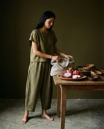 Made to order from medium weight Enzyme washed Linen Cotton blend, MOMOKO trousers combine comfort and durability with a materic texture. They have a very loose and wide fit, adapt to various sizes.